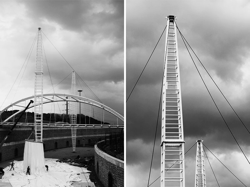 三、支承結構安裝張拉索膜結構的支承可分為剛性邊界和柔性邊界。支承結構安裝誤差的大小,不僅直接影響建筑的外觀,還影響結構內預應力的分布,嚴重者將影響結構的安全性。在安裝支承鋼結構前,應按規(guī)范和設計要求對鋼結構基礎的頂面標高、軸線尺寸做嚴格的復測,并作復測紀錄。支承結構安裝工藝流程為:鋼結構預埋交底→鋼結構預埋→鋼結構制作→基礎預埋復核→構件防腐涂裝→構件防火涂裝→構件吊裝。