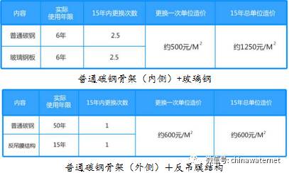 另外,通過(guò)對(duì)比分析了鋼支撐反吊膜與傳統(tǒng)水廠密封設(shè)施的性價(jià)相比,鋼支撐反吊膜結(jié)構(gòu)的密封設(shè)施使用年限為15年,單位面積造價(jià)僅600元/m2左右;而傳統(tǒng)密封設(shè)施一般15年內(nèi)需要更換2.5次,每次更換造價(jià)約500元/m2,15年總單位造價(jià)達(dá)1250元/m2,是鋼支撐反吊膜的兩倍多。從性價(jià)比方面看,鋼支撐反吊膜結(jié)構(gòu)也有明顯的優(yōu)勢(shì)。